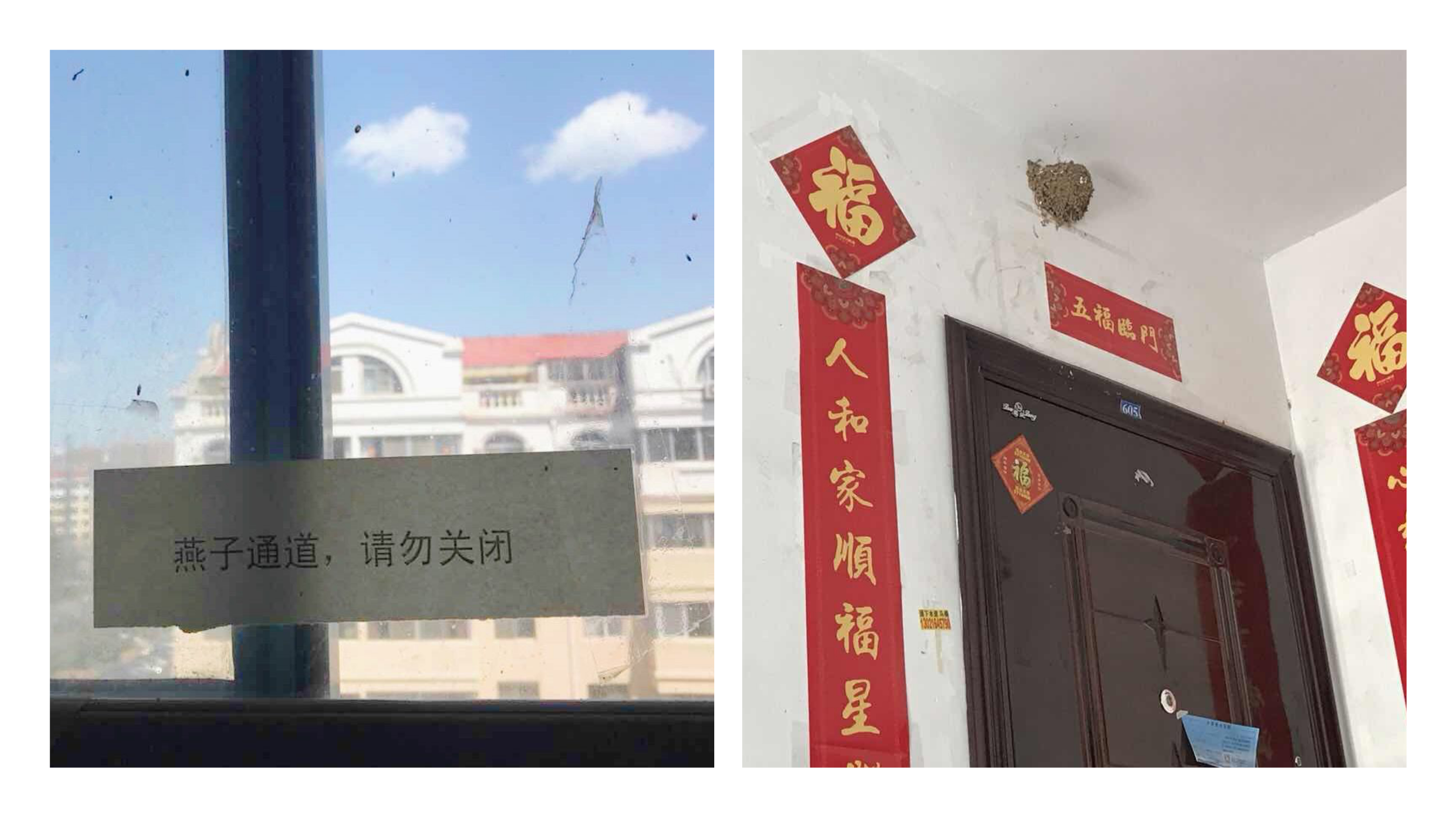 疫情解封后的那個(gè)月,我去新都二區(qū)上門貼欠費(fèi)單,遇到了“燕子之家”。正是走廊窗戶上的一張“燕子通道,請(qǐng)勿關(guān)閉”的紙條,引起了我的注意。通過紙條的指引,我看到了門上的燕子窩,此時(shí)窩里儼然還沒有燕子。